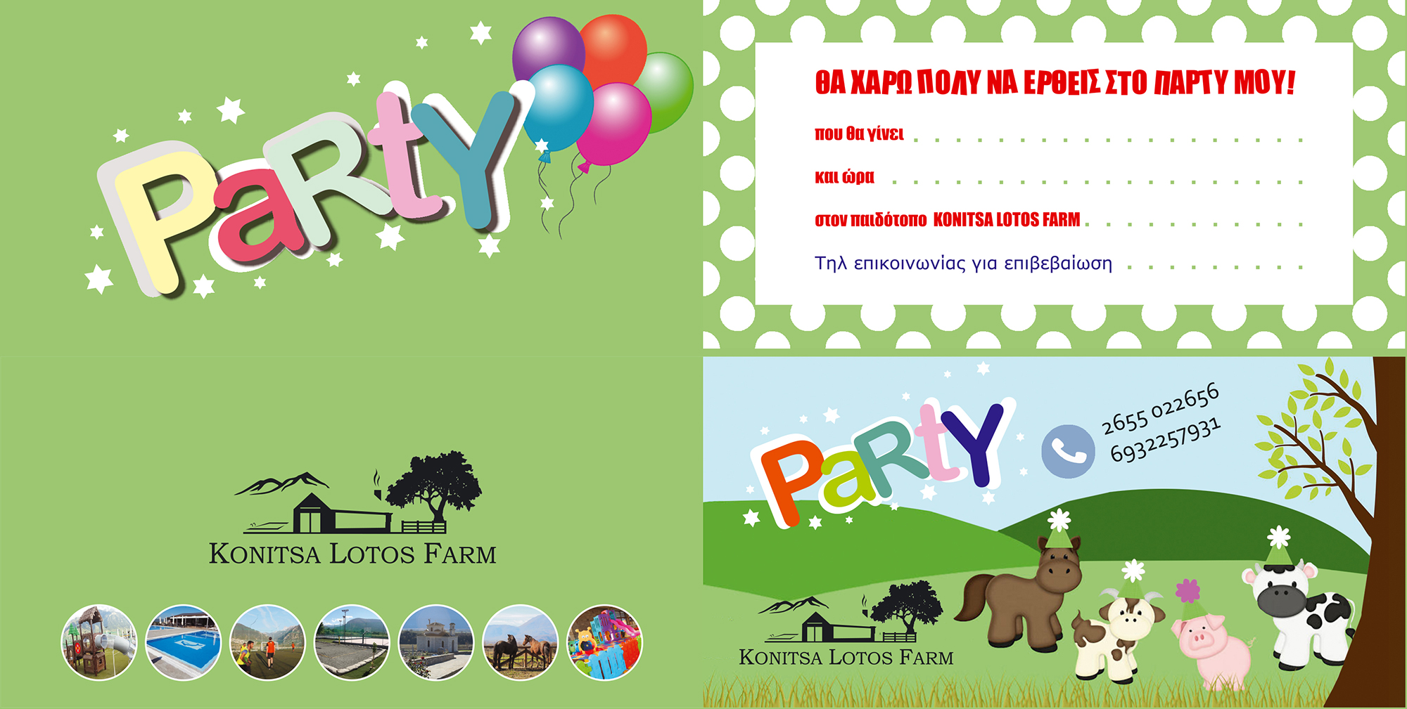 Ο εσωτερικός και εξωτερικός παιδότοπος του πολυχώρου Κόνιτσα Λώτος Φάρμα αποτελεί μια μοναδική πρόταση ποιοτικής αξιοποίησης του ελεύθερου χρόνου παιδιών, κάθε ηλικίας. Είναι ο ιδανικός χώρος για την οργάνωση παιδικού πάρτυ, τη φιλοξενία σχολικών εκδρομών και εκδηλώσεων αλλά και αθλητικών δραστηριοτήτων.